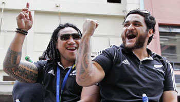 Hayley Holt, former girlfriend of Richie McCaw, interviews some of the All Blacks during their Rugby World Cup victory parade in Auckland on Monday. Andrew Hore looks a little hungover.