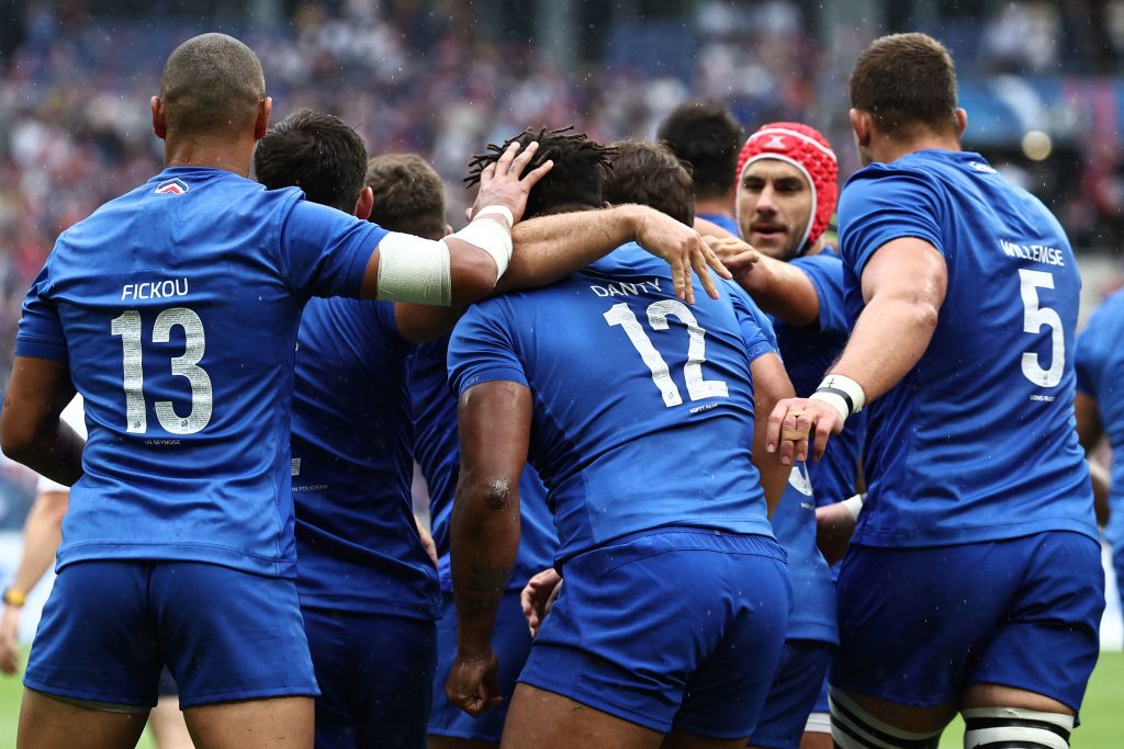 France’s outside centre Jonathan Danty (C/#12) celebrates with teammates after scoring a try during the pre-World Cup rugby union international Test match between France and Australia at Stade de France in Saint Denis, on the outskirts of Paris on August 27, 2023. (Photo by Anne-Christine POUJOULAT / AFP) (Photo by ANNE-CHRISTINE POUJOULAT/AFP via Getty Images)