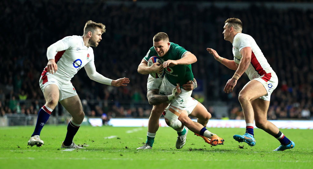 LONDON, ENGLAND – MARCH 12: Andrew Conway of Ireland is tackled by Henry Slade (R), Jack Nowell and Elliot Daly (L) during the Guinness Six Nations Rugby match between England and Ireland at Twickenham Stadium on March 12, 2022 in London, England. (Photo by David Rogers/Getty Images)