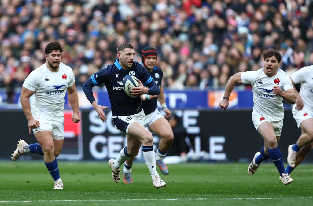 Scotland’s scrum-half Finn Russell (2nd L) runs with the ball chased by France’s hooker Julien Marchand (L) and France’s scrum-half Antoine Dupont (R) during the Six Nations rugby union tournament match between France and Scotland at the Stade de France in Saint-Denis, northern Paris, on February 26, 2023. (Photo by ANNE-CHRISTINE POUJOULAT / AFP) (Photo by ANNE-CHRISTINE POUJOULAT/AFP via Getty Images)