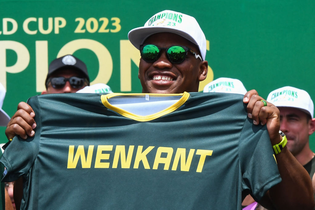 TOPSHOT – South Africa’s hooker Bongi Mbonambi holds a shirt which translates “winning side” during the Springboks Champions trophy tour in Cape Town on November 3, 2023, after South Africa won the France 2023 Rugby World Cup final match against New Zealand. (Photo by Rodger Bosch / AFP) (Photo by RODGER BOSCH/AFP via Getty Images)