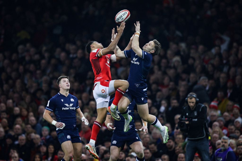 TOPSHOT – Wales’ wing Josh Adams (L) and Scotland’s full-back Kyle Rowe jump for the ball during the Six Nations international rugby union match between Wales and Scotland at the Principality Stadium in Cardiff, south Wales, on February 3, 2024. (Photo by Adrian DENNIS / AFP) / RESTRICTED TO EDITORIAL USE. Use in books subject to Welsh Rugby Union (WRU) approval. (Photo by ADRIAN DENNIS/AFP via Getty Images)