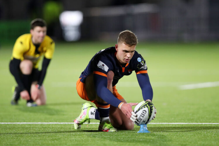 EDINBURGH, SCOTLAND – JANUARY 21: Charlie Savala of Edinburgh Rugby prepares to kick a conversion during the EPCR Challenge Cup match between Edinburgh Rugby and CA Brive at DAM Health Stadium on January 21, 2022 in Edinburgh, Scotland. (Photo by Ian MacNicol/Getty Images)