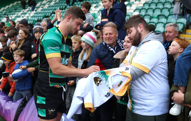 NORTHAMPTON, ENGLAND – OCTOBER 21: Saints’ James Grayson signs an autograph for fans after the Gallagher Premiership Rugby match between Northampton Saints and Bristol Bears at cinch Stadium at Franklin’s Gardens on October 21, 2023 in Northampton, England. (Photo by Peter Nicholls/Getty Images)