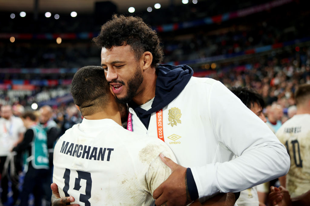 PARIS, FRANCE – OCTOBER 27: Joe Marchant and Courtney Lawes of England embrace at full-time following their team’s victory in the Rugby World Cup France 2023 Bronze Final match between Argentina and England at Stade de France on October 27, 2023 in Paris, France. (Photo by Adam Pretty – World Rugby/World Rugby via Getty Images)