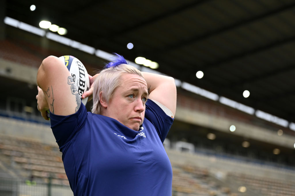 CAPE TOWN, SOUTH AFRICA – OCTOBER 27: Lana Skeldon of Scotland warms up prior to the WXV 2 2023 match between Scotland and Japan at Athlone Sports Stadium on October 27, 2023 in Cape Town, South Africa. (Photo by Johan Rynners – World Rugby/World Rugby via Getty Images)