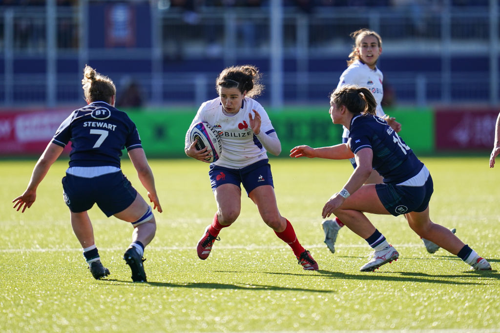 EDINBURGH, SCOTLAND – MARCH 30: Gabrielle Vernier of France is tackled by Alex Stewart and Helen Nelson of Scotland during the Guinness Women’s Six Nations 2024 match between Scotland and France at Hive Stadium – Edinburgh Rugby Stadium on March 30, 2024 in Edinburgh, United Kingdom. (Photo by Peter Summers/Getty Images)