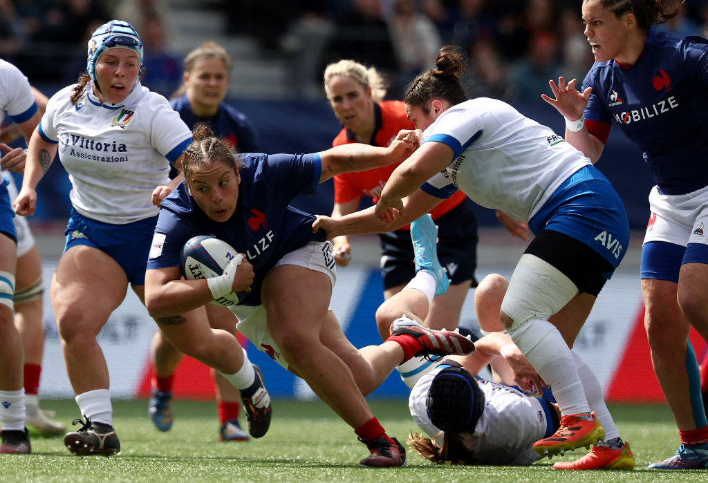 France’s prop Assia Khalfaoui (C) is tackled by Italy’s hooker Vittoria Vecchini (R) during Six Nations international women’s rugby union match between France and Italy at Jean Bouin in Paris, on April 14, 2024. (Photo by FRANCK FIFE / AFP) (Photo by FRANCK FIFE/AFP via Getty Images)