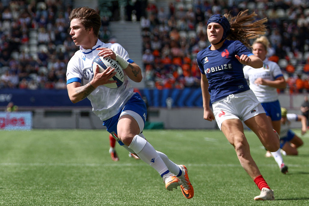 Italy’s left wing Alyssa D’Inca (L) runs with a ball during the Six Nations international women’s rugby union match between France and Italy at the Jean Bouin Stadium in Paris, on April 14, 2024. (Photo by FRANCK FIFE / AFP) (Photo by FRANCK FIFE/AFP via Getty Images)
