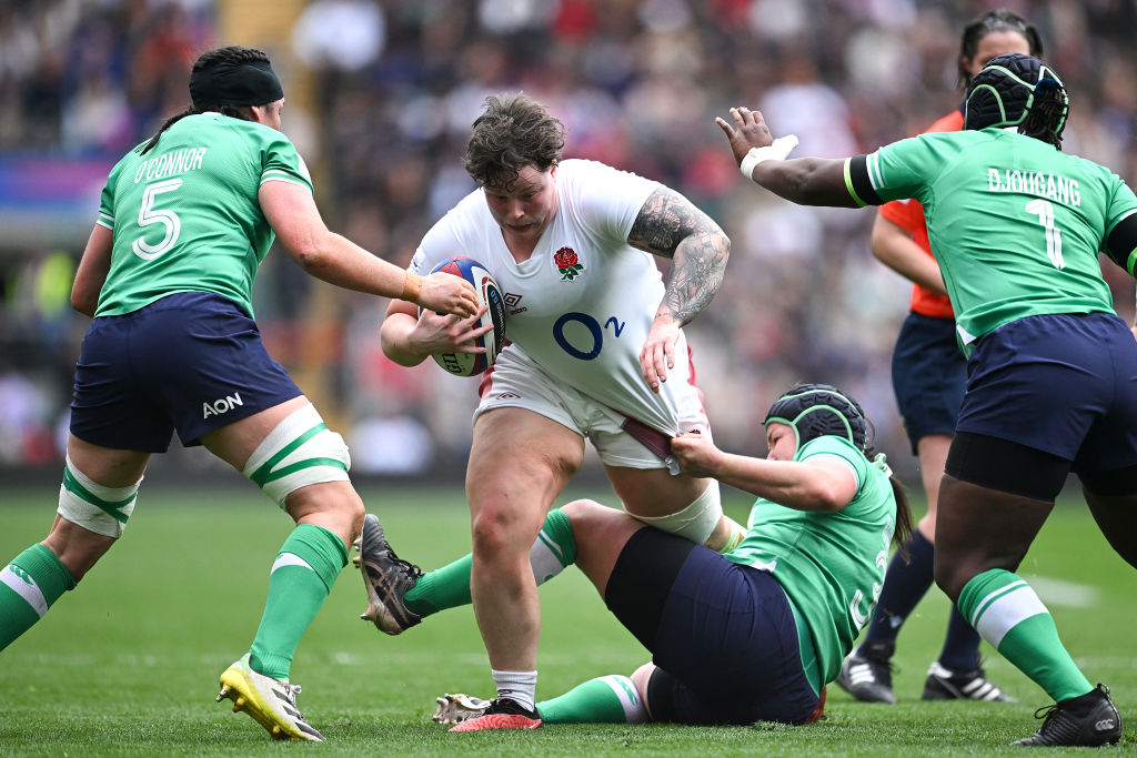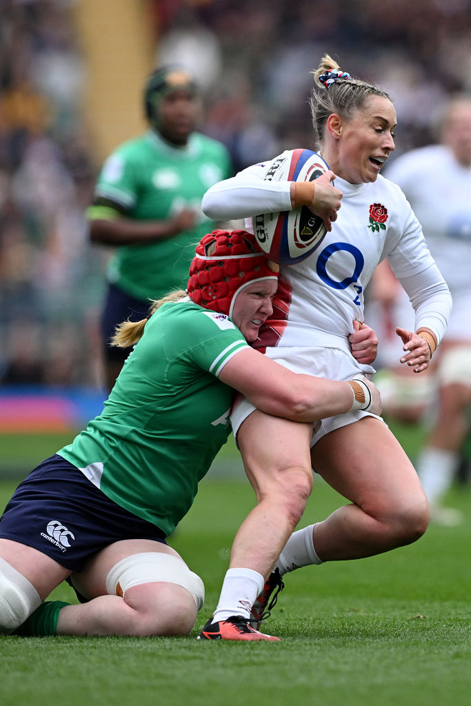 England’s prop Hannah Botterman is tackled during the Six Nations international women’s rugby union match between England and Ireland at Twickenham in south-west London on April 20, 2024. (Photo by JUSTIN TALLIS / AFP) (Photo by JUSTIN TALLIS/AFP via Getty Images)
