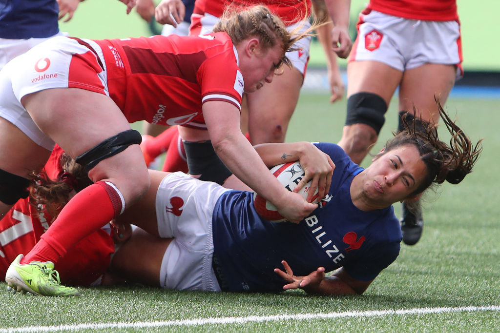 France’s lock Manae Feleu scores the team’s fifth try during the Six Nations international women’s rugby union match between Wales and France at Cardiff Arms Park in Cardiff, south Wales on April 21, 2024. (Photo by Geoff Caddick / AFP) (Photo by GEOFF CADDICK/AFP via Getty Images)