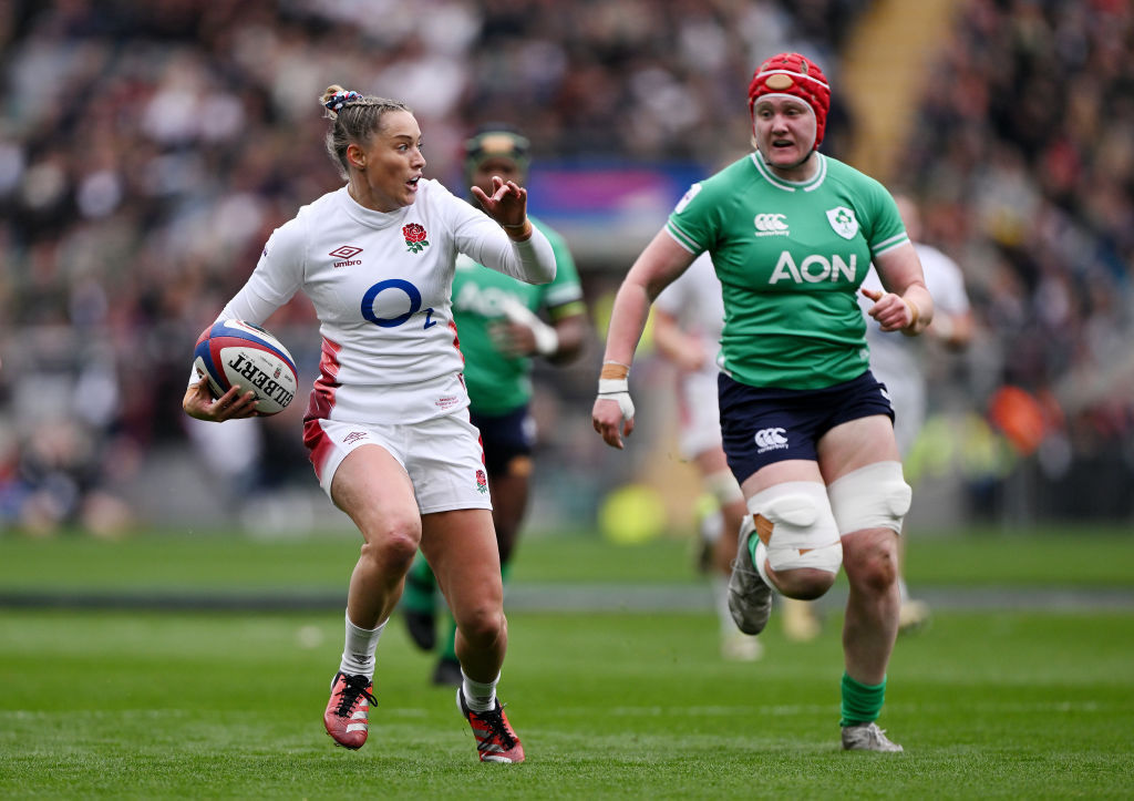 LONDON, ENGLAND – APRIL 20: Natasha Hunt of England breaks with the ball during the Guinness Women’s Six Nations 2024 match between England and Ireland at Twickenham Stadium on April 20, 2024 in London, England. (Photo by Mike Hewitt/Getty Images)