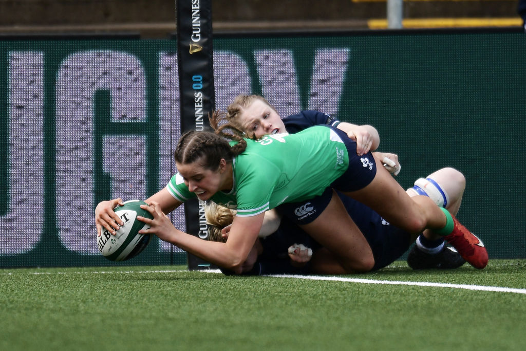 BELFAST, NORTHERN IRELAND – APRIL 27: Katie Corrigan of Ireland scores her team’s first try during the Guinness Women’s Six Nations 2024 match between Ireland and Scotland at Kingspan Stadium on April 27, 2024 in Belfast, Northern Ireland. (Photo by Charles McQuillan/Getty Images)