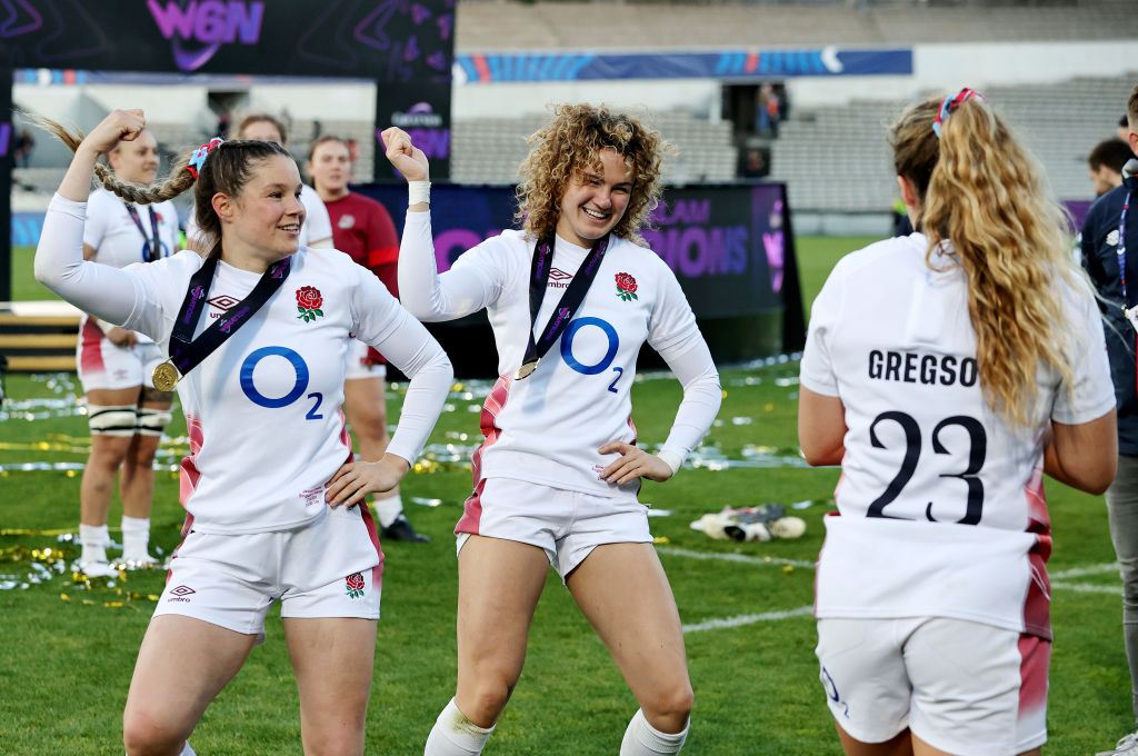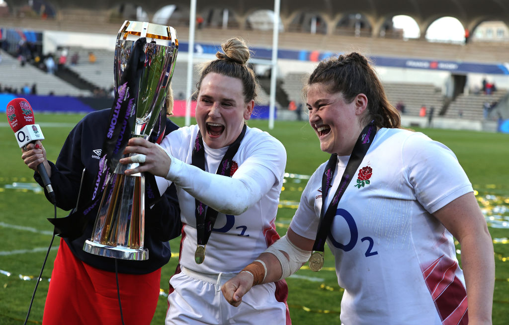 BORDEAUX, FRANCE – APRIL 27: Megan Jones (L) and Maud Muir of England celebrate after their Grand Slam Six Nations victory during the Guinness Women’s Six Nations 2024 match between France and England at Stade Chaban-Delmas on April 27, 2024 in Bordeaux, France. (Photo by David Rogers/Getty Images)