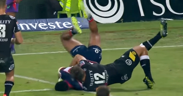 Sharks centre Andre Esterhuizen was shown a straight red card for this nasty looking tackle during the dour 9-9 draw with the Melbourne Rebels on Saturday. Esterhuizen has since been suspended for 6 weeks, after it was ruled that he contravened Law 10.4(j).