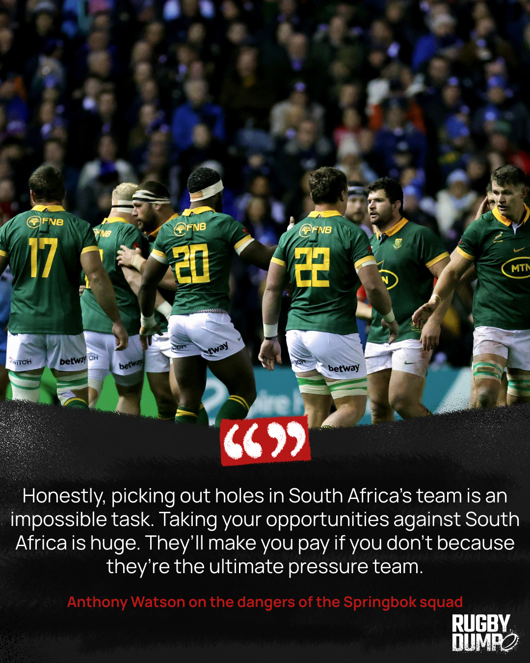 Anthony notes that the focus is on the forward pack, but the back line is no easier to deal with. Naming the likes of Cheslin Kolbe, Jesse Kriel, Damian de Allende and others, Watson exasperatedly asks how you go about dealing with them: