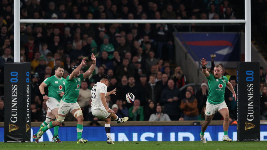 England’s Marcus Smith scores the winning drop goal during the Six Nations international rugby union match between England and Ireland at Twickenham Stadium in south-west London, on March 9, 2024. (Photo by Adrian DENNIS / AFP) (Photo by ADRIAN DENNIS/AFP via Getty Images)