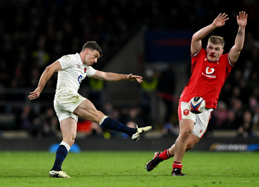 LONDON, ENGLAND – FEBRUARY 10: George Ford of England kicks the ball passed Archie Griffin of Wales during the Guinness Six Nations 2024 match between England and Wales at Twickenham Stadium on February 10, 2024 in London, England. (Photo by Mike Hewitt/Getty Images)