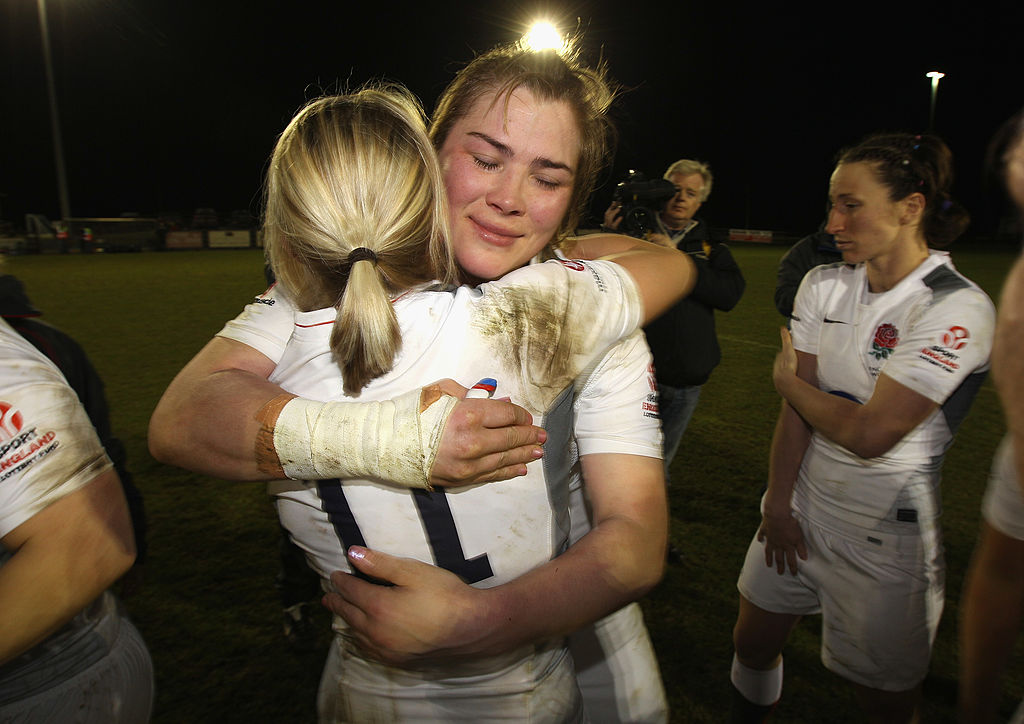 ASHBOURNE, IRELAND – MARCH 18: An emotional former England captain, Catherine Spencer (R) is congratulated by team mate Francesca Matthews after playing her final match after their Grand Slam win the victory in the Womens Six Nations match between Ireland and England at Ashbourne Rugby Club on March 18, 2011 in Ashbourne, Ireland. (Photo by David Rogers/Getty Images)