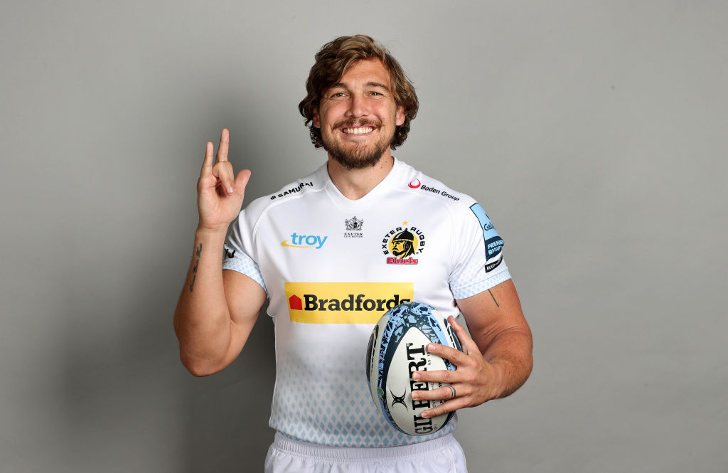 EXETER, ENGLAND – AUGUST 03: Aidon Davis of Exeter Chiefs poses for a portrait during the squad photocall for the 2023-2024 Gallagher Premiership Rugby season at Sandy Park on August 03, 2023 in Exeter, England. (Photo by David Rogers/Getty Images)