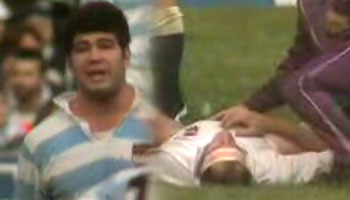 Argentina’s 18-year-old prop Federico Mendez leaves the pitch after being sent off following a punch that laid out England’s Paul Ackford. Mendez was winning only his second cap.