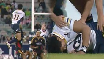 But on the weekend in the Super 14 we saw tremendous commitment from young Brumbies winger Francis Fainifo under the high ball. Chiefs flyer Lelia Masaga chased hard but mistimed his run unfortunately, and ended up taking Fainifo out which caused him to flip through the air and land horrifically. Masaga also got a knee in the face for his troubles.