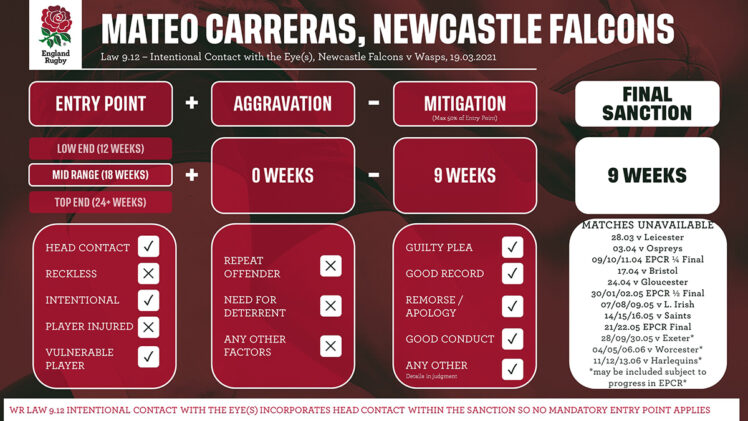 Newcastle wing Mateo Carreras has been given a nine-week suspension for making intentional contact with the eye area of Wasps back Josh Bassett.