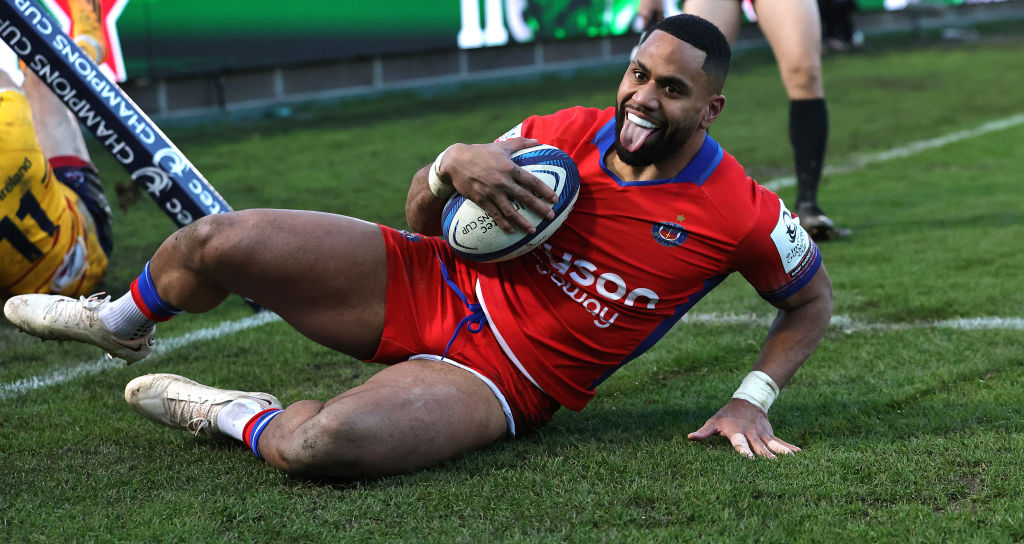 BATH, ENGLAND – DECEMBER 09: Joe Cokanasiga of Bath dives in to score their first try during the Investec Champions Cup match between Bath and Ulster at the Recreation Ground on December 09, 2023 in Bath, England. (Photo by David Rogers/Getty Images)