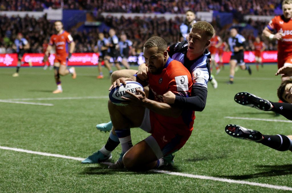 CARDIFF, WALES – DECEMBER 16: Ollie Lawrence of Bath Rugby scores their team’s second try whilst under pressure from Cam Winnett of Cardiff Rugby during the Investec Champions Cup match between Cardiff Rugby and Bath Rugby at Cardiff Arms Park on December 16, 2023 in Cardiff, Wales. (Photo by Michael Steele/Getty Images)