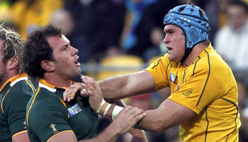 Quick exchange of flat hand slaps between James Horwill and Bismarck Du Plessis during the Wallabies’ 11-9 quarter final win in Wellington. Neither player was reprimanded or penalised.