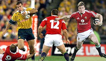 Superstar Irishman O’Driscoll gets hammered by Wallaby center Nathan Grey on the British and Irish Lions tour of Australia in 2001.