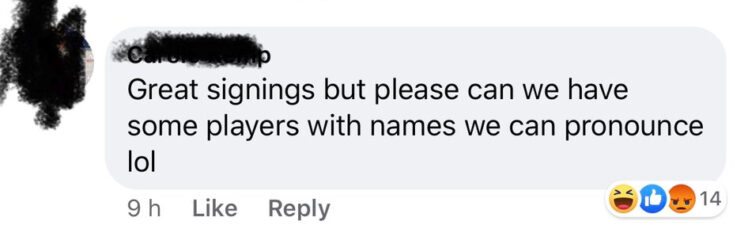 “A comment made on the signing of my mate Kini Murimurivalu by one of the supporters.. sorry but I don’t stand for this shit…I’ll let head office know tomorrow to change my name to Bob to make it easier for some!”