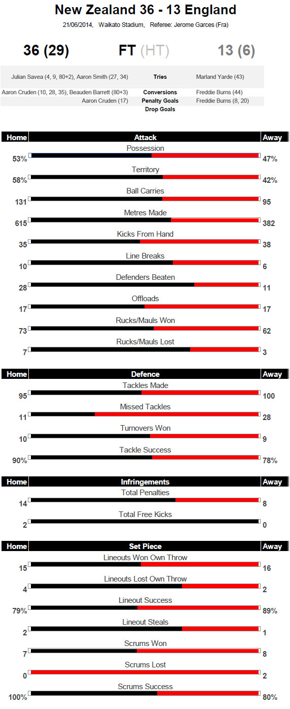 New Zealand completed a 3-0 whitewash of England as they stormed to a 36-13 victory in Hamilton on Saturday. The damage was done in the first half as the All Blacks shot out to a 29-6 lead, but England held on to limit the damage in the second half.