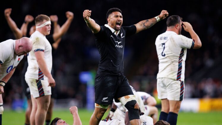 LONDON, ENGLAND – NOVEMBER 2: New Zealand’s Ardie Savea celebrates at the final whistle during the Autumn Nations Series 2024 match between England and New Zealand All Blacks at Allianz Stadium on November 2, 2024 in London, England. (Photo by Bob Bradford – CameraSport via Getty Images)