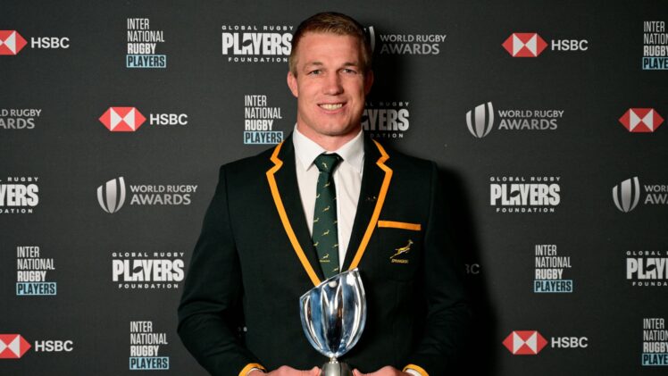 South Africa’s Pieter-Steph du Toit poses with a trophy after he receives the World Rugby Men’s 15s Player of the Year prize during the 2024 World Rugby Awards ceremony at the Sporting Monte-Carlo complex in Monaco, on November 24, 2024. (Photo by Frederic Dides / AFP) (Photo by FREDERIC DIDES/AFP via Getty Images)