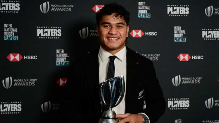 New Zealand’s Wallace Sititi poses with a trophy as he receives the World Rugby Men’s 15s Breakthrough Player of the Year during the 2024 World Rugby Awards ceremony at the Sporting Monte-Carlo complex in Monaco, on November 24, 2024. (Photo by Frederic Dides / AFP) (Photo by FREDERIC DIDES/AFP via Getty Images)