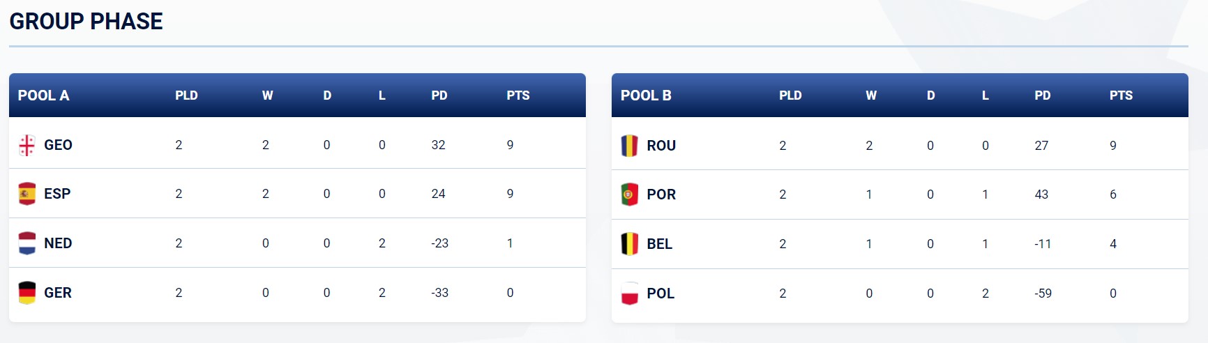 On the other side of the competition, Pool B is yet to be decided, with Romania, Portugal and Belgium all still in the running for qualification. Romania take on Portugal in a ‘winner takes all’ match, whilst Belgium take on bottom place Poland in an effort to leapfrog those above them.