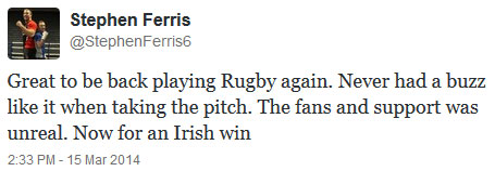 It’s been a good few days for Ireland fans. They won the Six Nations, Brian O’Driscoll went out in style, and flanker Stephen Ferris, who has been out with a long injury lay-off, made his return. He marked it with a typically determined and powerful tackle.