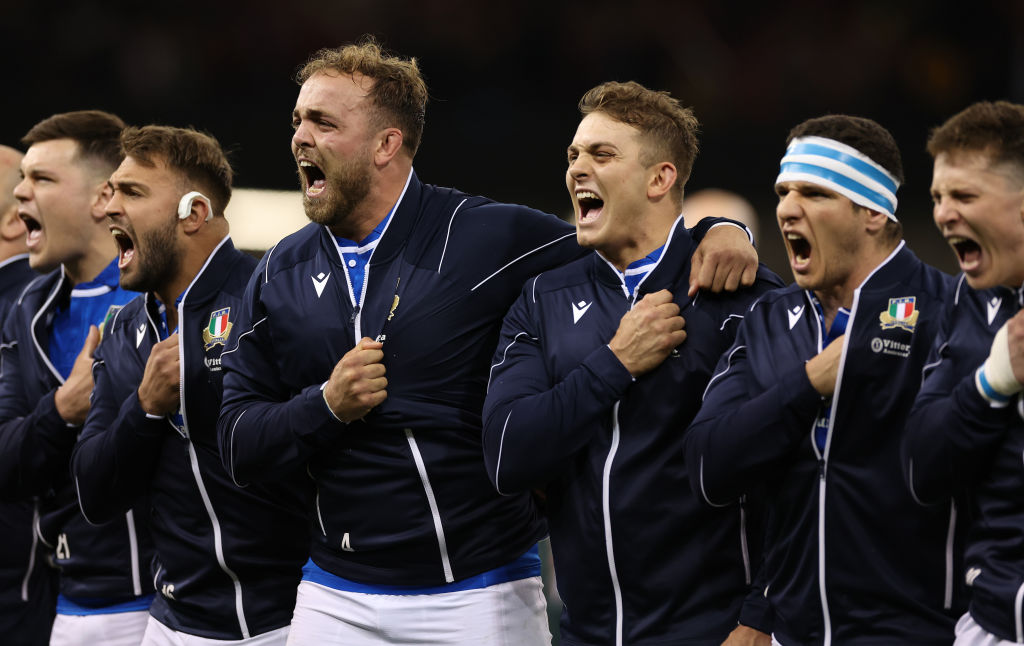 CARDIFF, WALES – MARCH 16: Italy’s Niccolo Cannoni, Lorenzo Cannone and Danilo Fischetti of Italy in full voice during the national anthem ahead of the Guinness Six Nations 2024 match between Wales and Italy at Principality Stadium on March 16, 2024 in Cardiff, Wales. (Photo by Michael Steele/Getty Images)