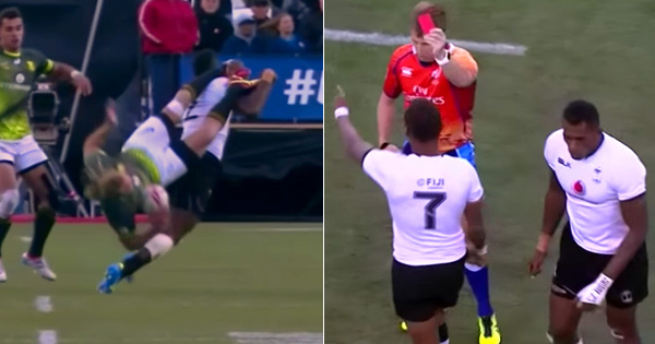 It was an ugly end to an otherwise entertaining final. Fiji, having just scored in the previous play to keep their chances of victory alive, desperately needed to get their hands on the ball from the restart, hence the clumsy challenge on Kok.
