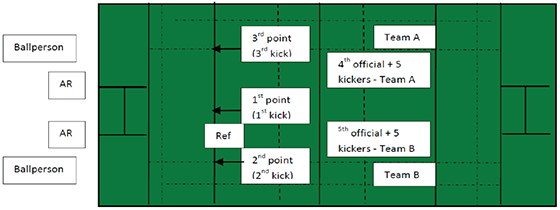 vi) The next two Players (one from each Team) will place kick from the second point in turn. This will continue until all five Players from each Team have place kicked (the next players place kicking respectively from the third point, the first point and finally the second point), or until one Team is unable to equal the score of the other Team within the remaining number of kicks (at which time the Referee will declare the winner).