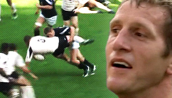 We had a request for this great tackle that he put in on former British & Irish Lions prop Darren Morris early in the game. The International XV were tossing the ball about intently, but Scott Gibbs did Morris no favours with the hospital pass he presented him.